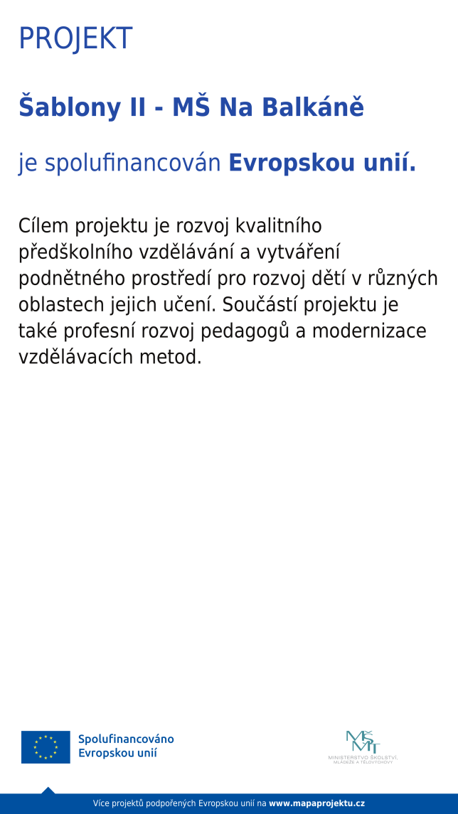 Kontaktní poštovní adresa: Mateřská škola, Na Balkáně 74/2590, 130 00 Praha 3